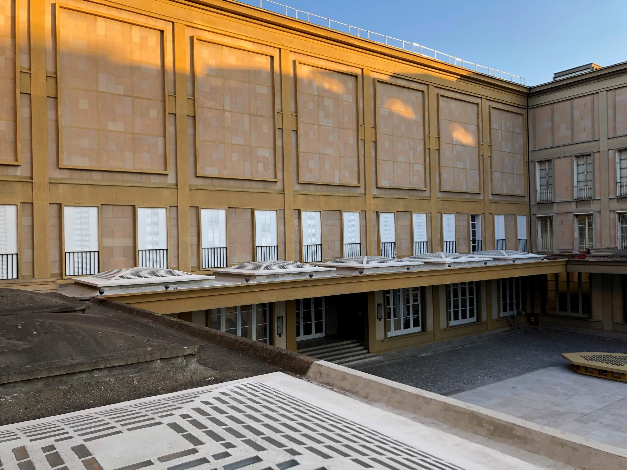 – La seconde opération concerne les façades extérieures et les couvertures des ailes hautes. Les bétons ont été restaurés et un travail de finition colorée et de patine a été effectué sur les parements pour retrouver la coloration que Perret avait appliqué sur les bétons et venir se raccorder avec les vestiges encore en place (badigeons ocres-jaunes essuyés après séchage et légèrement brossés). Tous les ouvrages de second œuvre ont été révisés ou refaits à l’identique (menuiseries, persiennes, grilles).