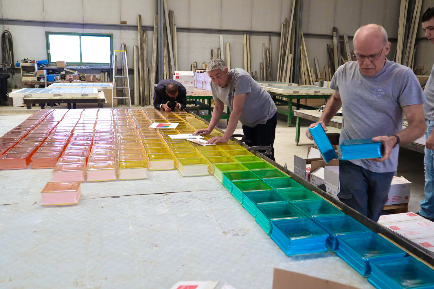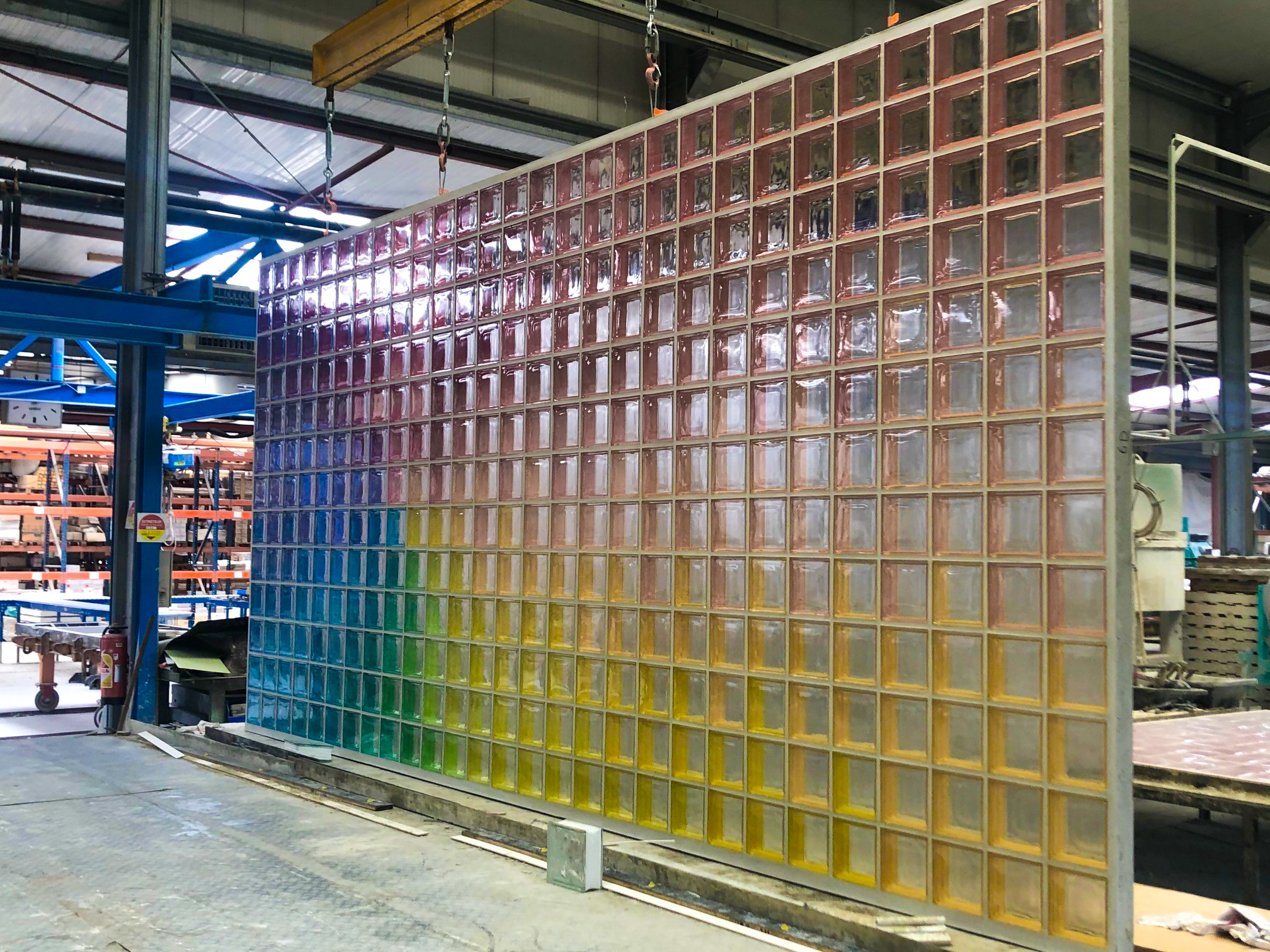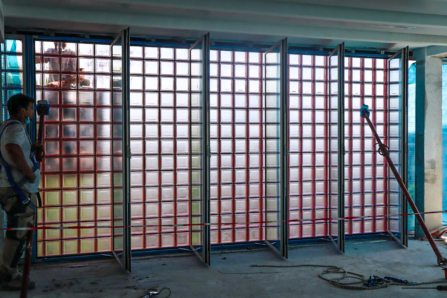 Le défi de ce projet résidait dans l’assemblage méticuleux de 13 500 briques de verre. Pour répondre au concept de l’architecte, inspiré par les prismes de Newton et la décomposition du spectre solaire, Saverbat a mis en œuvre un dégradé chromatique d’une complexité rare utilisant 30 nuances sur mesure.