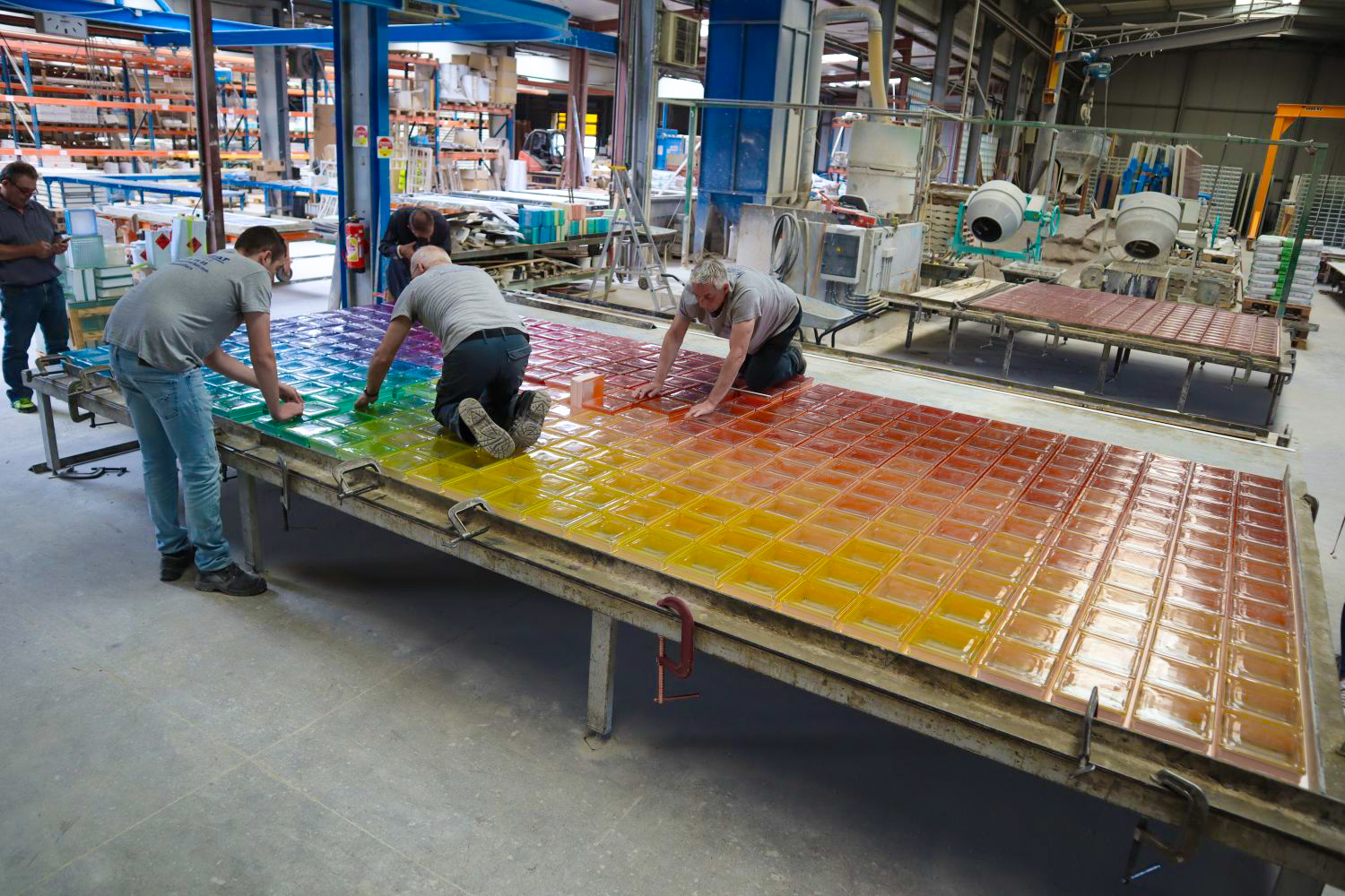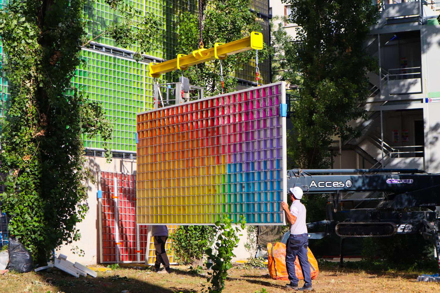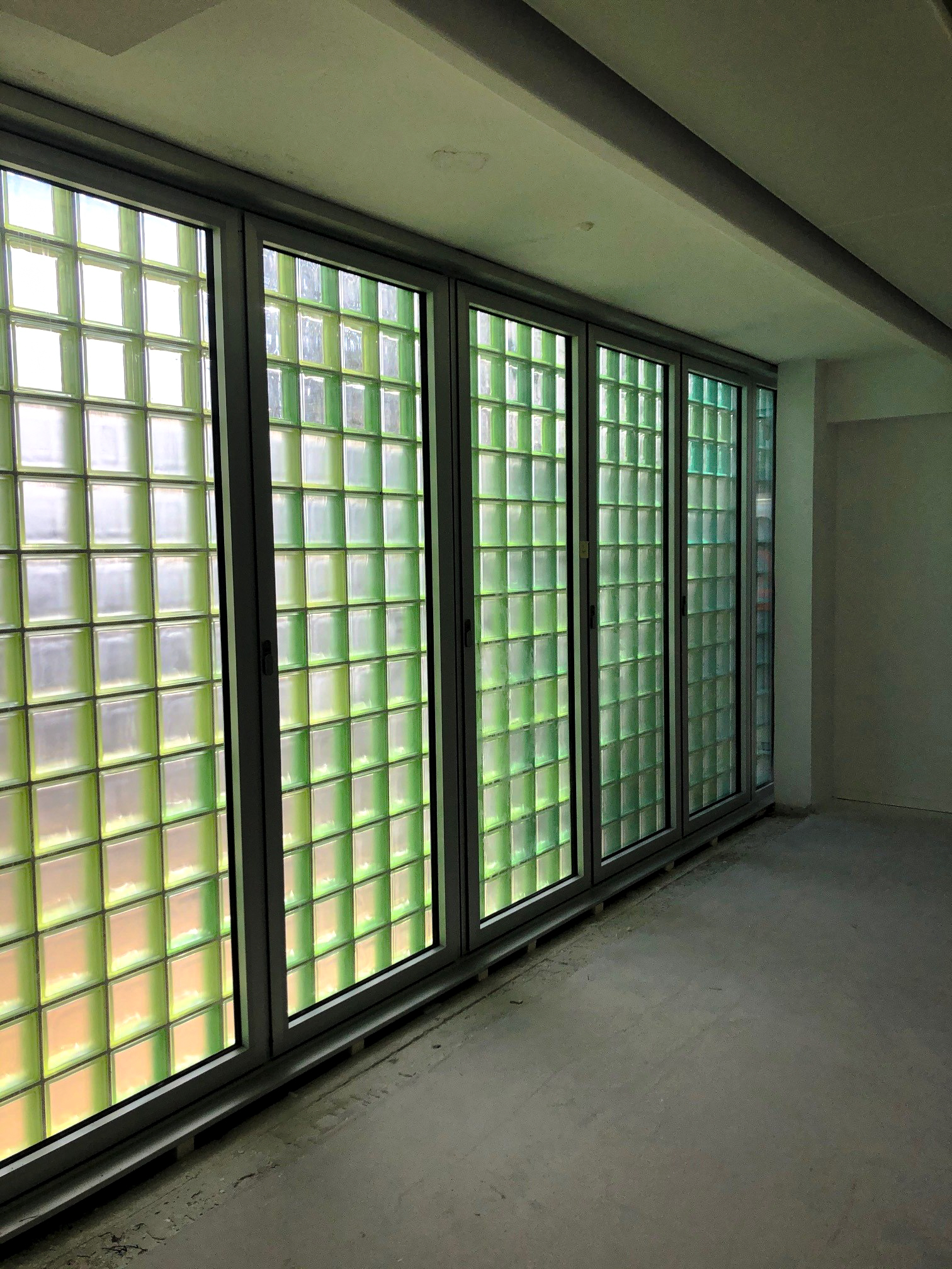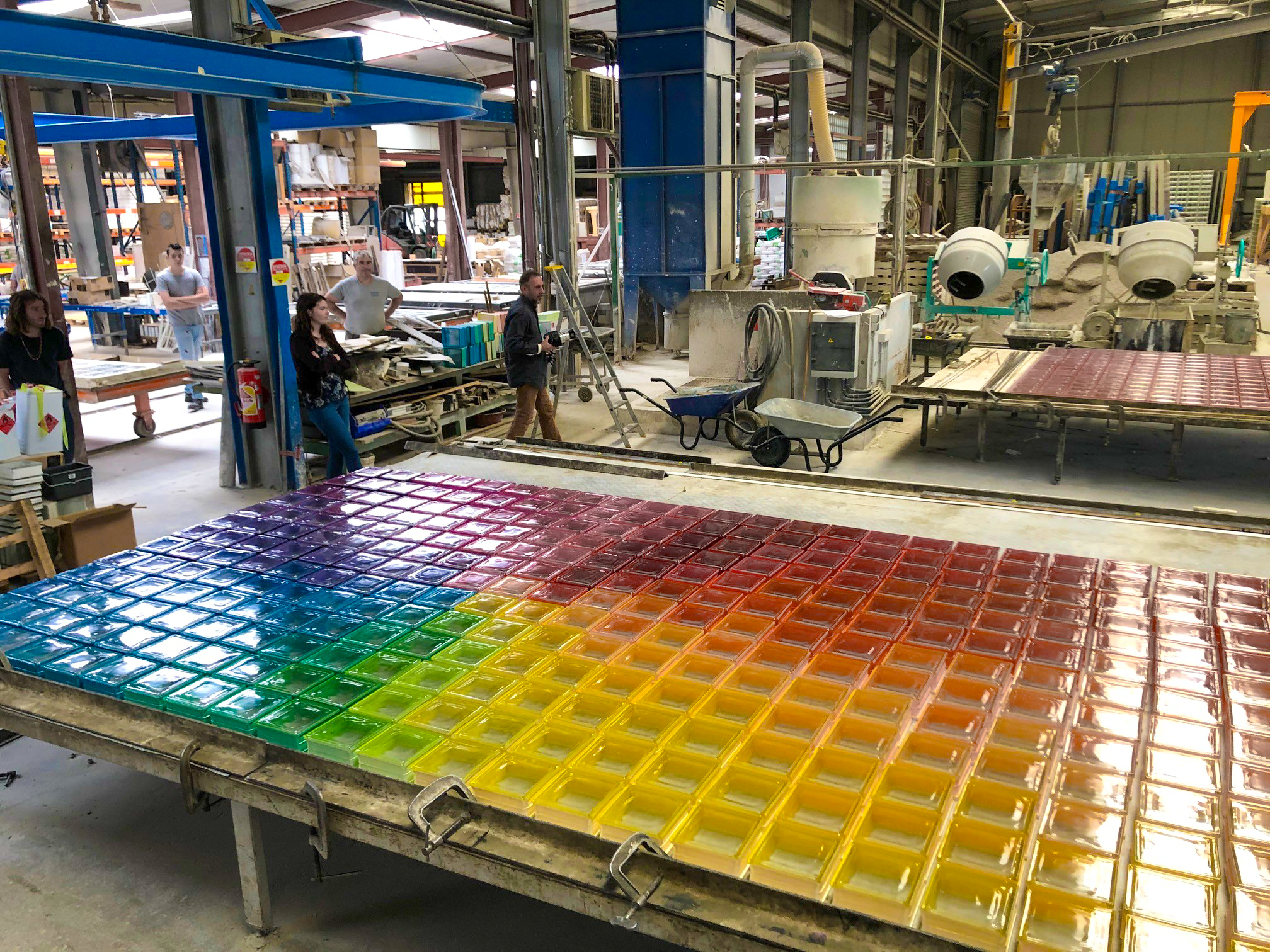 Le défi de ce projet résidait dans l’assemblage méticuleux de 13 500 briques de verre. Pour répondre au concept de l’architecte, inspiré par les prismes de Newton et la décomposition du spectre solaire, Saverbat a mis en œuvre un dégradé chromatique d’une complexité rare utilisant 30 nuances sur mesure.