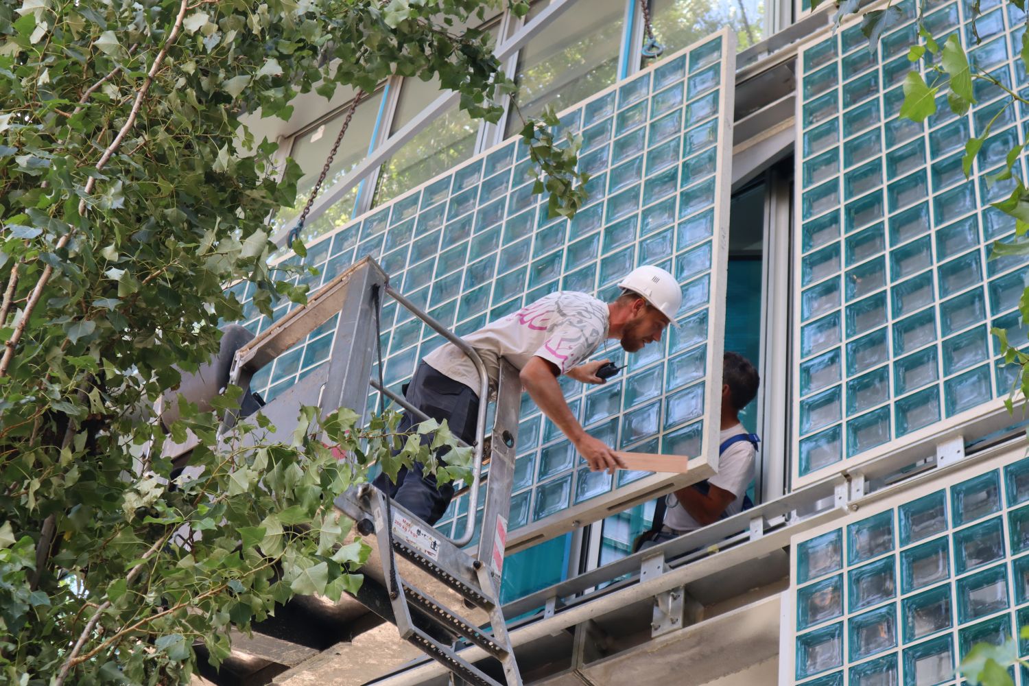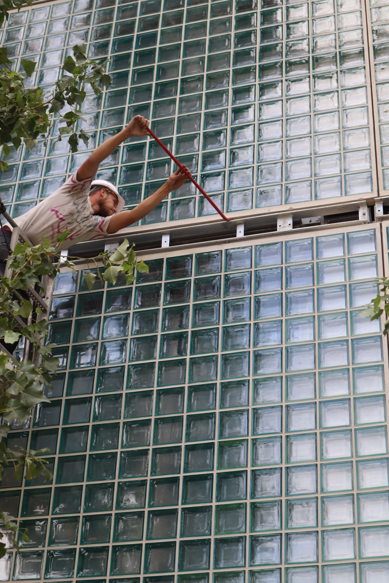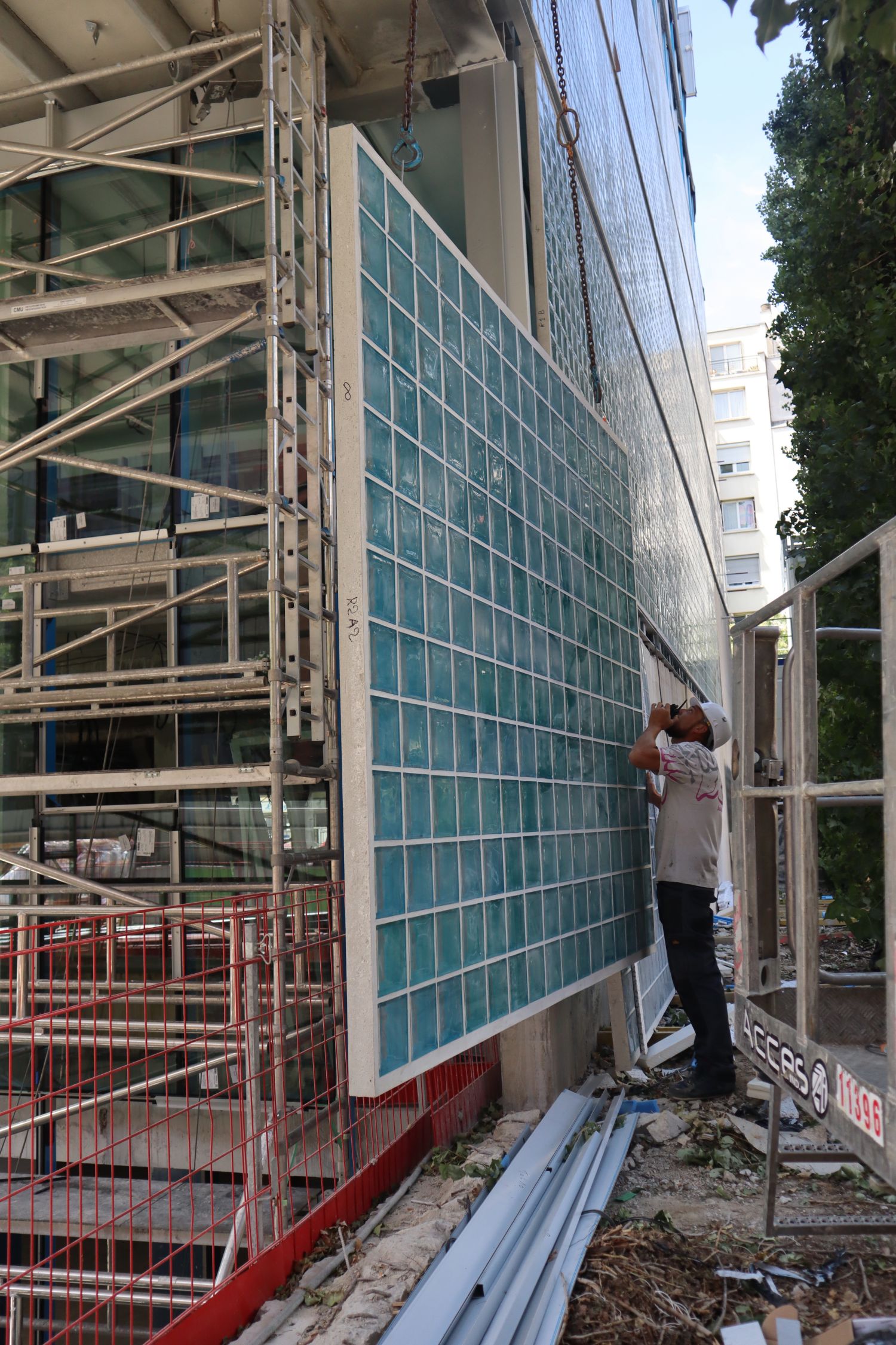 Ce projet de réhabilitation et d’extension de l’immeuble situé au 25 rue de Tolbiac comporte un mur mitoyen de 9 étages, composée d’un assemblage de briques de verre de forme carrée. Le but de ce geste architectural étant de laisser passer le plus de lumière naturelle à l’intérieur du bâtiment, il m’a paru évident de ne pas intervenir sur la surfaces des briques de verre mais de travailler sur l’épaisseur de cette peau lumineuse. Depuis presque 30 ans, la référence à la lumière naturelle est au coeur de mes interventions dans des contextes architecturaux et des sites paysagers. Mes recherches s’inscrivant essentiellement dans un langage sculptural, ce qui m’intéresse, c’est de mettre en relation les qualités d’un matériau avec la transformation continue de la lumière sur un site.