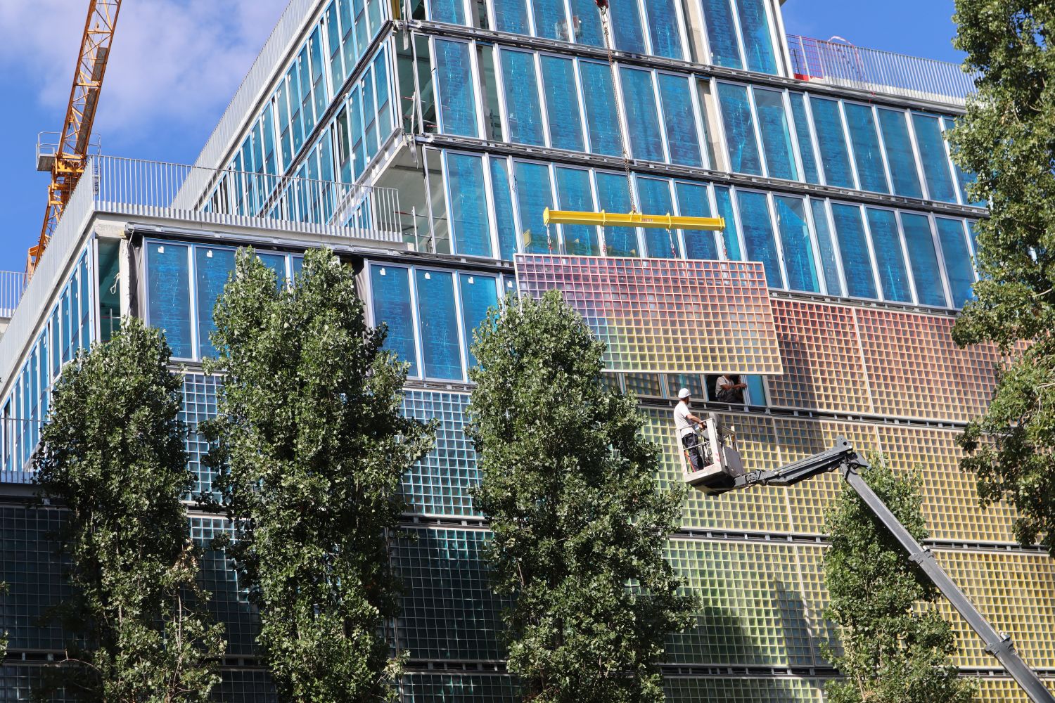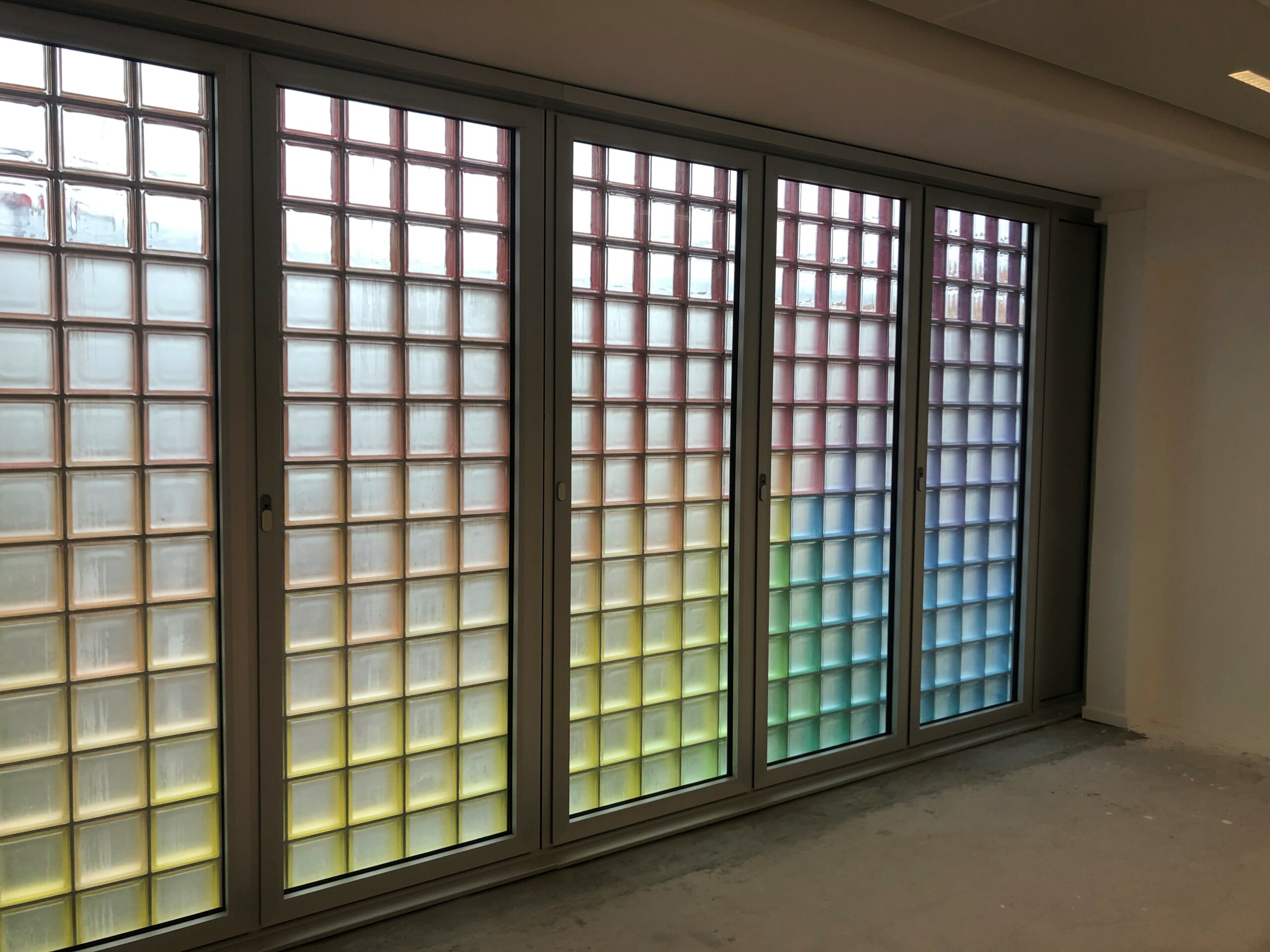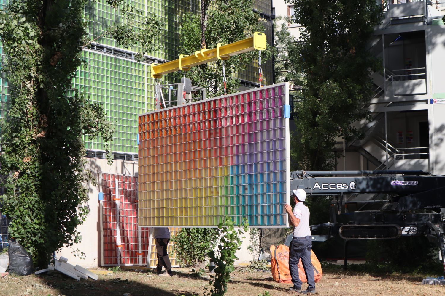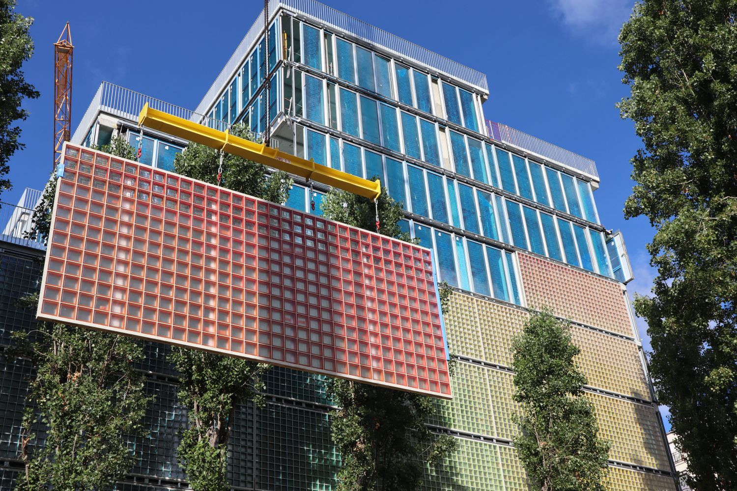 L’objet premier de cette intervention est une mise en relation physique et optique entre la façade en verre et la lumière naturelle. La présence d’un écran composé de 13’500 briques de verre a éveillé dans mon imaginaire la représentation d’une image pixelisée, articulée avec le prisme en verre qu’Isaac Newton a expérimenté en 1666. Lorsqu’un rayon du soleil passe au travers d’un prisme, il se décompose et fait apparaître les couleurs de l’arc-en-ciel, ces couleurs étant propres à la lumière et non au prisme en verre qui la décompose. De cette expérience, Isaac Newton a retenu sept couleurs : rouge, orange, jaune, vert, bleu, indigo et violet. Au moyen des 30 couleurs que j’ai choisies pour ce projet, je n’ai fait qu’amplifier le dégradé qui décline ces nuances, afin que l’intensité de la couleur déposée, permette à l’oeil de les capter comme un ensemble homogène, qui éveille en nous la sensation d’une transformation presque imperceptible, mais continue, selon le point de vue du spectateur, selon l’intensité de lumière présente sur le site, selon les saisons, les interférences lumineuses du soir ou de la nuit. C’est à ce point que commence le travail de la sculpture, à travers une mise en relation entre l’alignement orthogonal de l’assemblage des briques et le déploiement de la couleur suivant méticuleusement la progression des sections triangulaires propres au cercle chromatique. Cette oeuvre, monumentale, «respire» selon le rythme de l’intensité de la lumière sur le site, selon les interférences liées à la transparence du verre qui révèle la couleur et qui parfois la met en concurrence avec d’autres reflets. Depuis la rue, une sensation d’ensemble homogène s’impose à la vue, alors que depuis l’intérieur, sur chaque étage du bâtiment, les usagers ont une expérience visuelle et sensuelle par «coupes horizontales» d’une répartition apparemment aléatoire des couleurs.