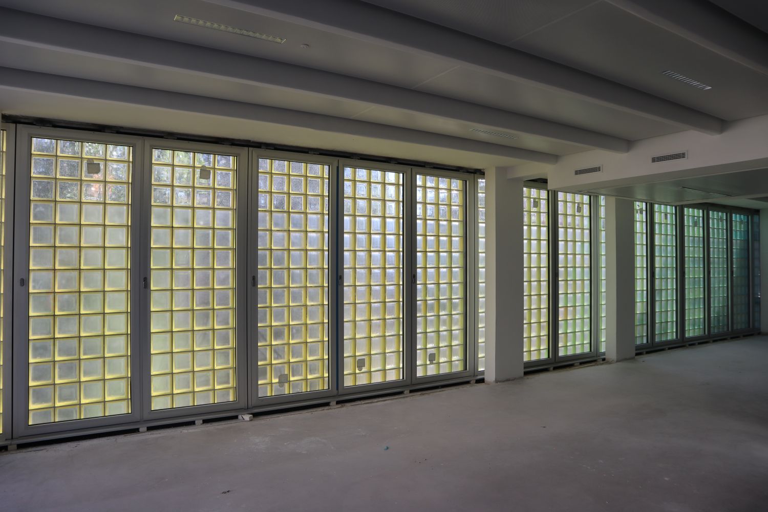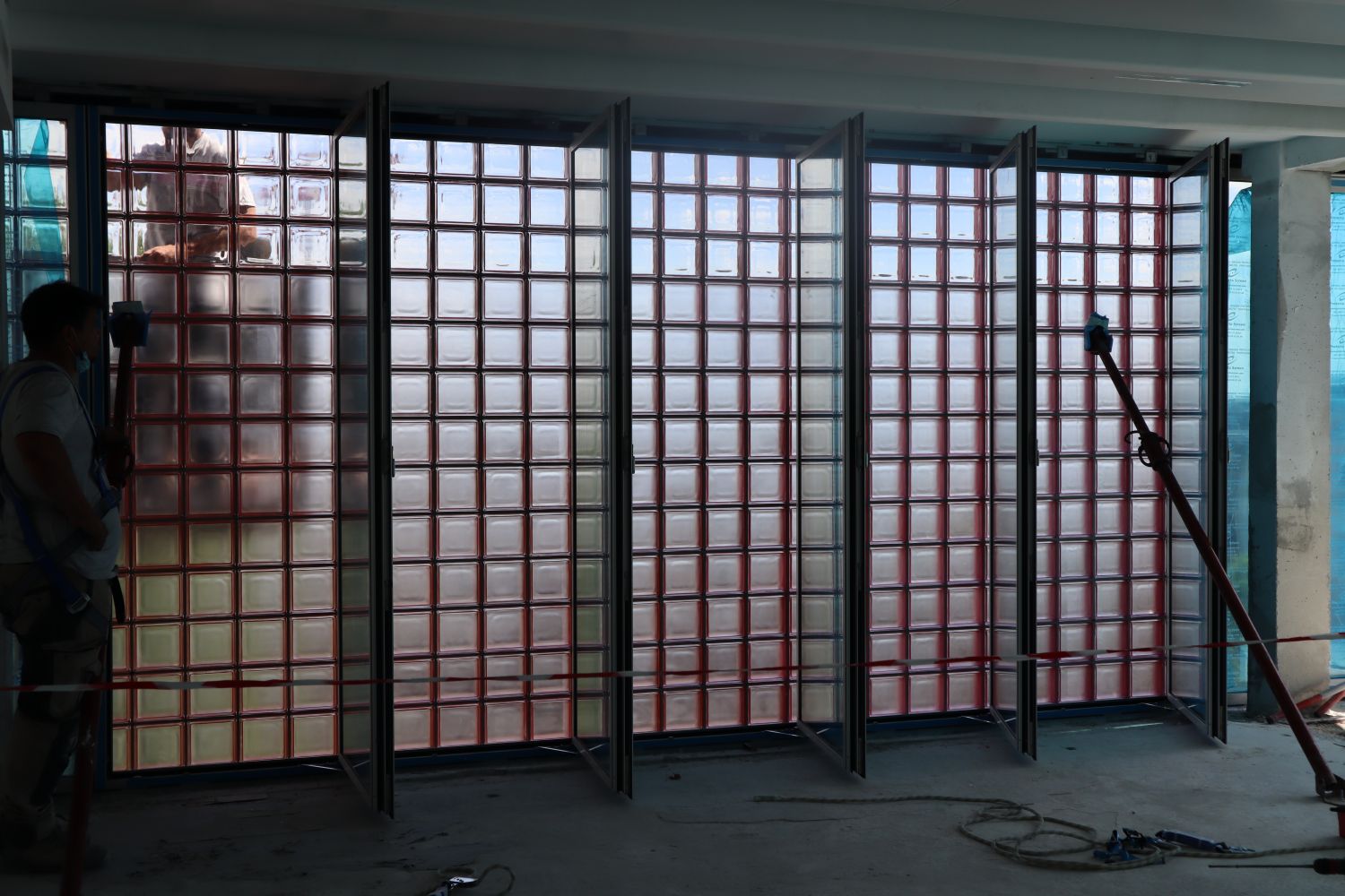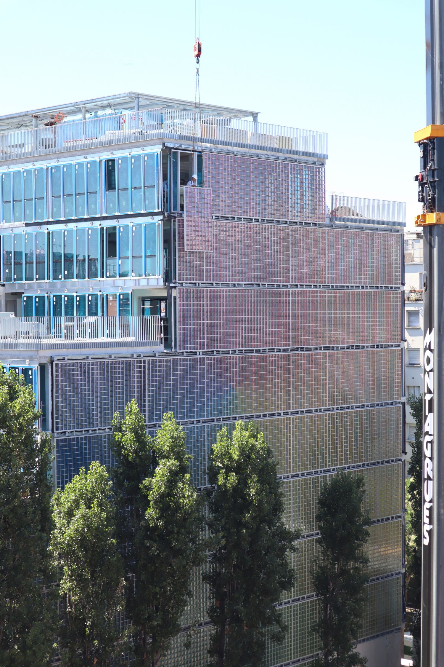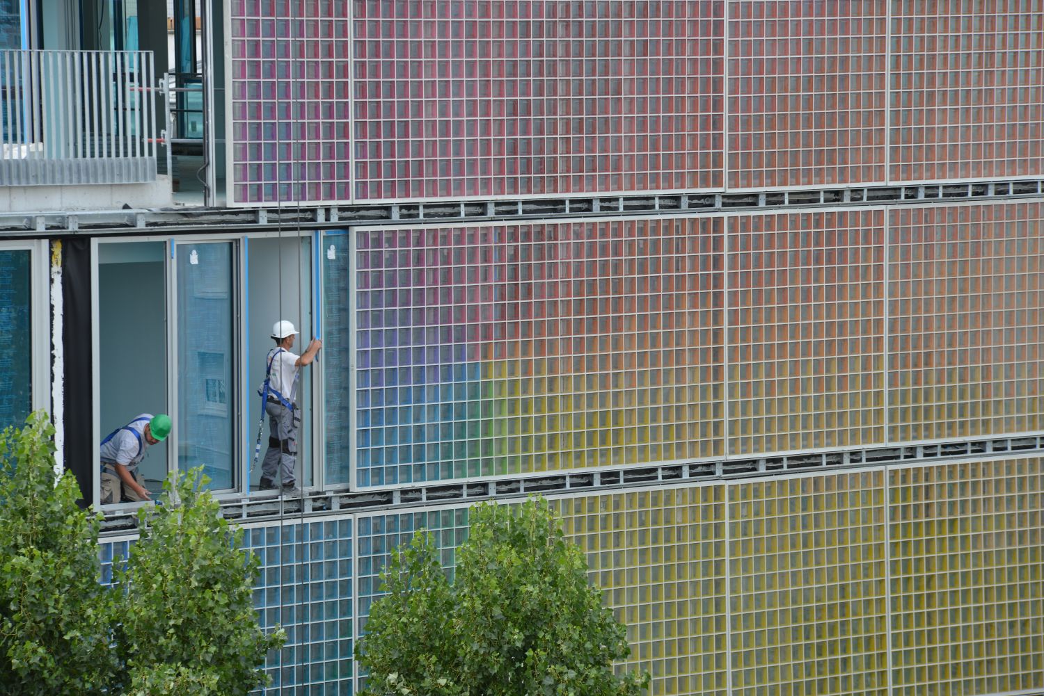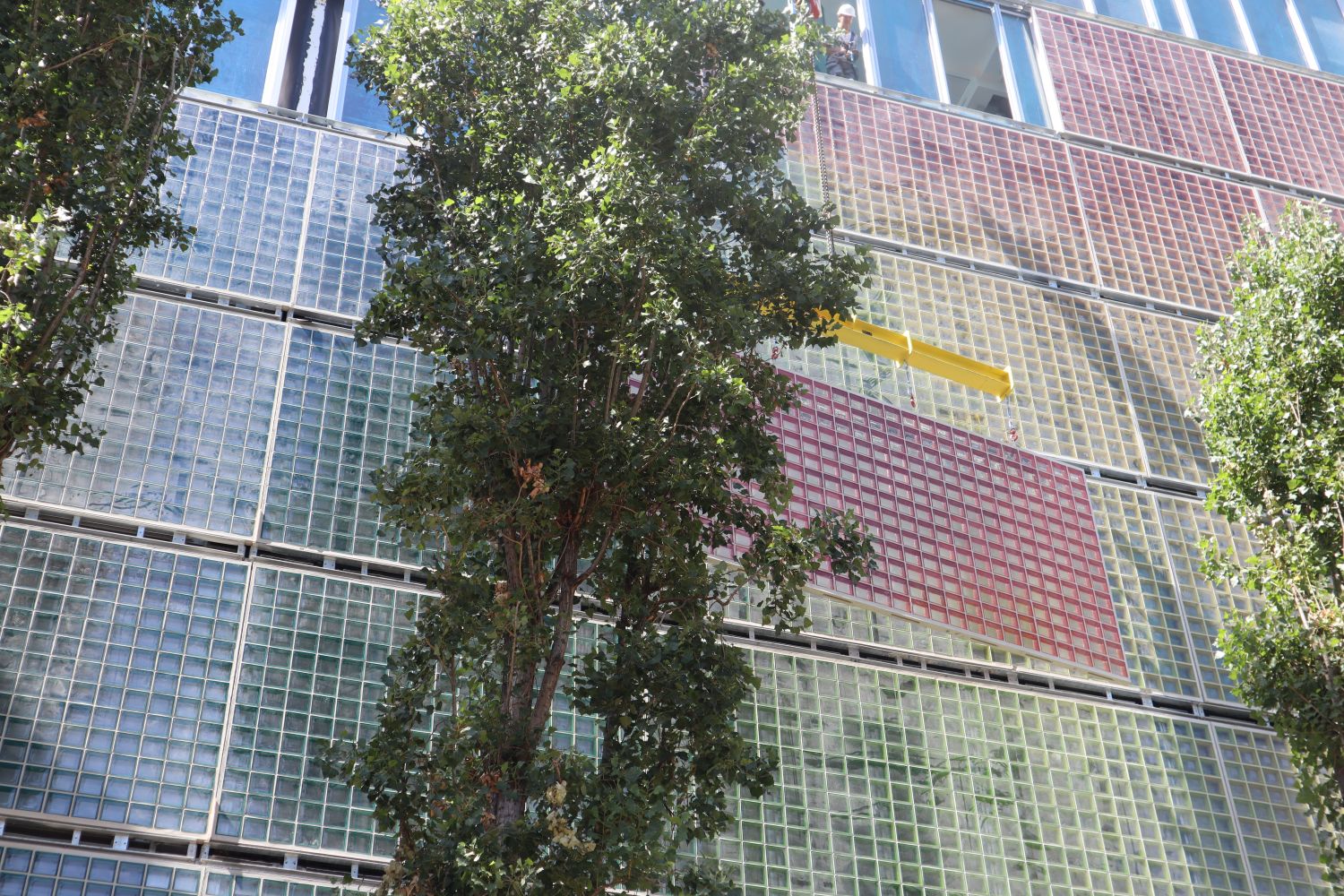L’objet premier de cette intervention est une mise en relation physique et optique entre la façade en verre et la lumière naturelle. La présence d’un écran composé de 13’500 briques de verre a éveillé dans mon imaginaire la représentation d’une image pixelisée, articulée avec le prisme en verre qu’Isaac Newton a expérimenté en 1666. Lorsqu’un rayon du soleil passe au travers d’un prisme, il se décompose et fait apparaître les couleurs de l’arc-en-ciel, ces couleurs étant propres à la lumière et non au prisme en verre qui la décompose. De cette expérience, Isaac Newton a retenu sept couleurs : rouge, orange, jaune, vert, bleu, indigo et violet. Au moyen des 30 couleurs que j’ai choisies pour ce projet, je n’ai fait qu’amplifier le dégradé qui décline ces nuances, afin que l’intensité de la couleur déposée, permette à l’oeil de les capter comme un ensemble homogène, qui éveille en nous la sensation d’une transformation presque imperceptible, mais continue, selon le point de vue du spectateur, selon l’intensité de lumière présente sur le site, selon les saisons, les interférences lumineuses du soir ou de la nuit. C’est à ce point que commence le travail de la sculpture, à travers une mise en relation entre l’alignement orthogonal de l’assemblage des briques et le déploiement de la couleur suivant méticuleusement la progression des sections triangulaires propres au cercle chromatique. Cette oeuvre, monumentale, «respire» selon le rythme de l’intensité de la lumière sur le site, selon les interférences liées à la transparence du verre qui révèle la couleur et qui parfois la met en concurrence avec d’autres reflets. Depuis la rue, une sensation d’ensemble homogène s’impose à la vue, alors que depuis l’intérieur, sur chaque étage du bâtiment, les usagers ont une expérience visuelle et sensuelle par «coupes horizontales» d’une répartition apparemment aléatoire des couleurs.