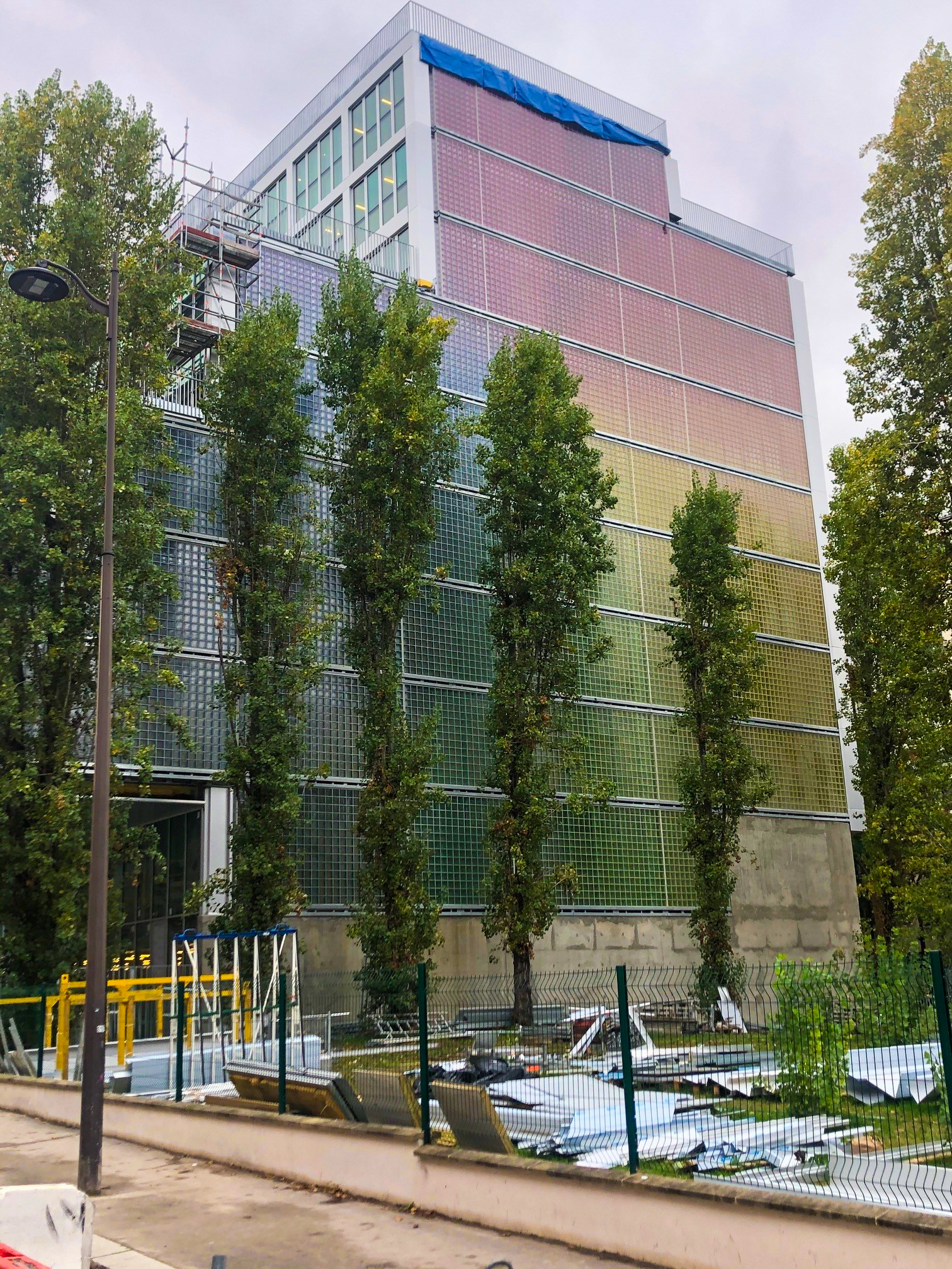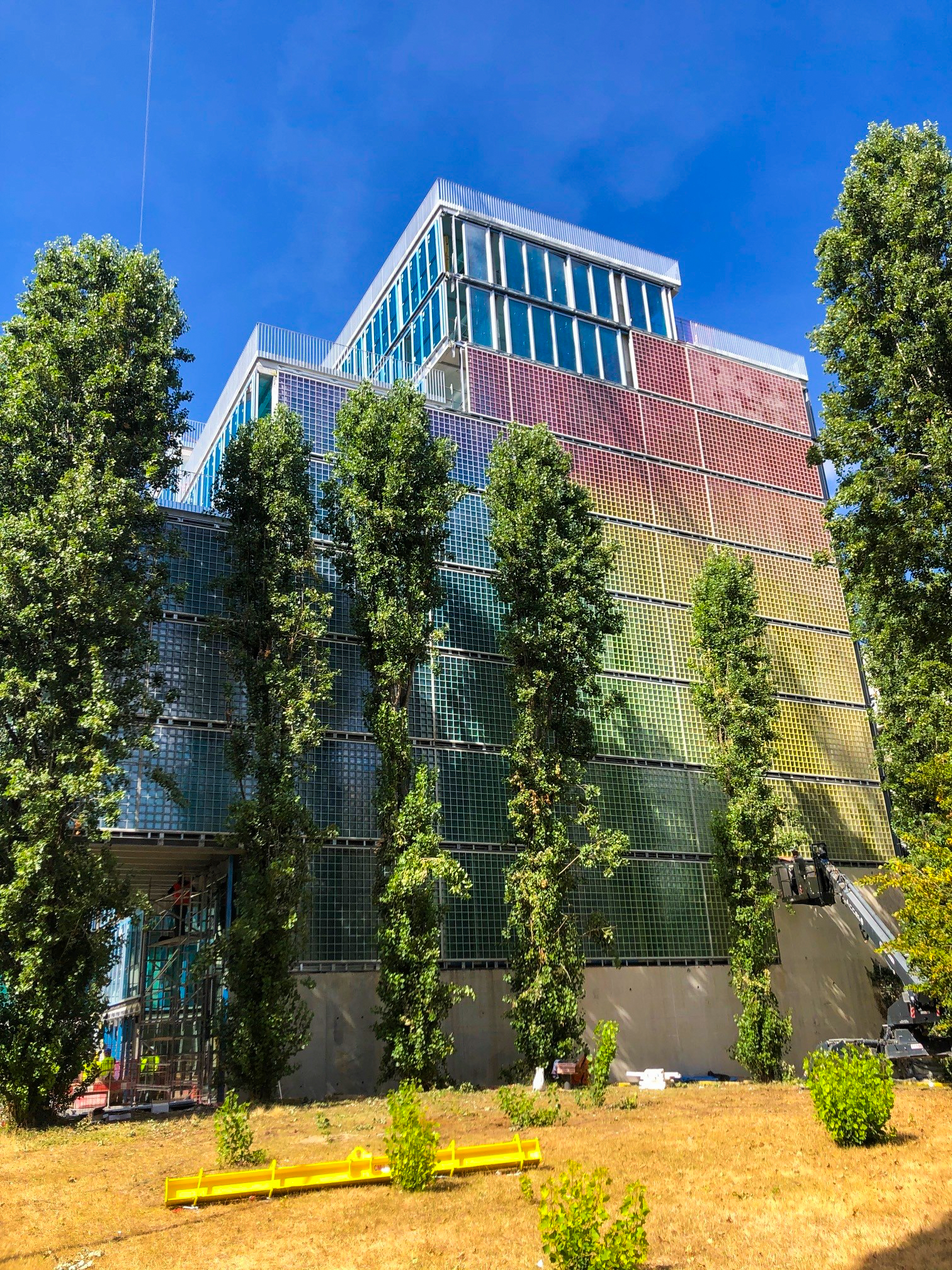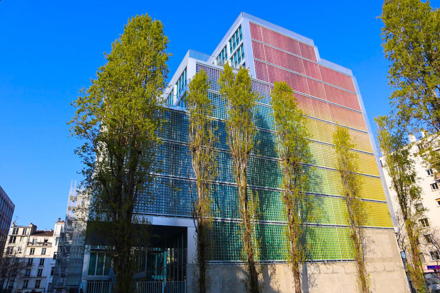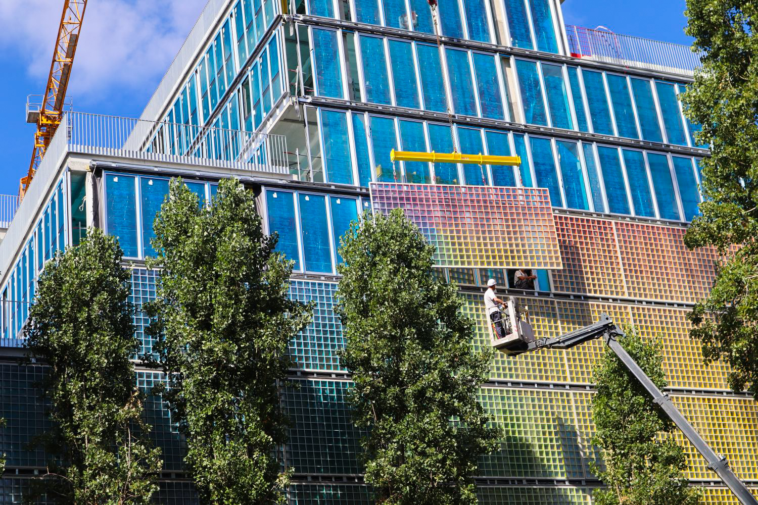 - Depuis l’intérieur : pour les usagers, l’expérience est sensorielle. Chaque étage propose une “coupe horizontale” du cercle chromatique, où les couleurs se répartissent de façon apparemment aléatoire, baignant les espaces de travail dans une lumière naturelle colorée et apaisante.