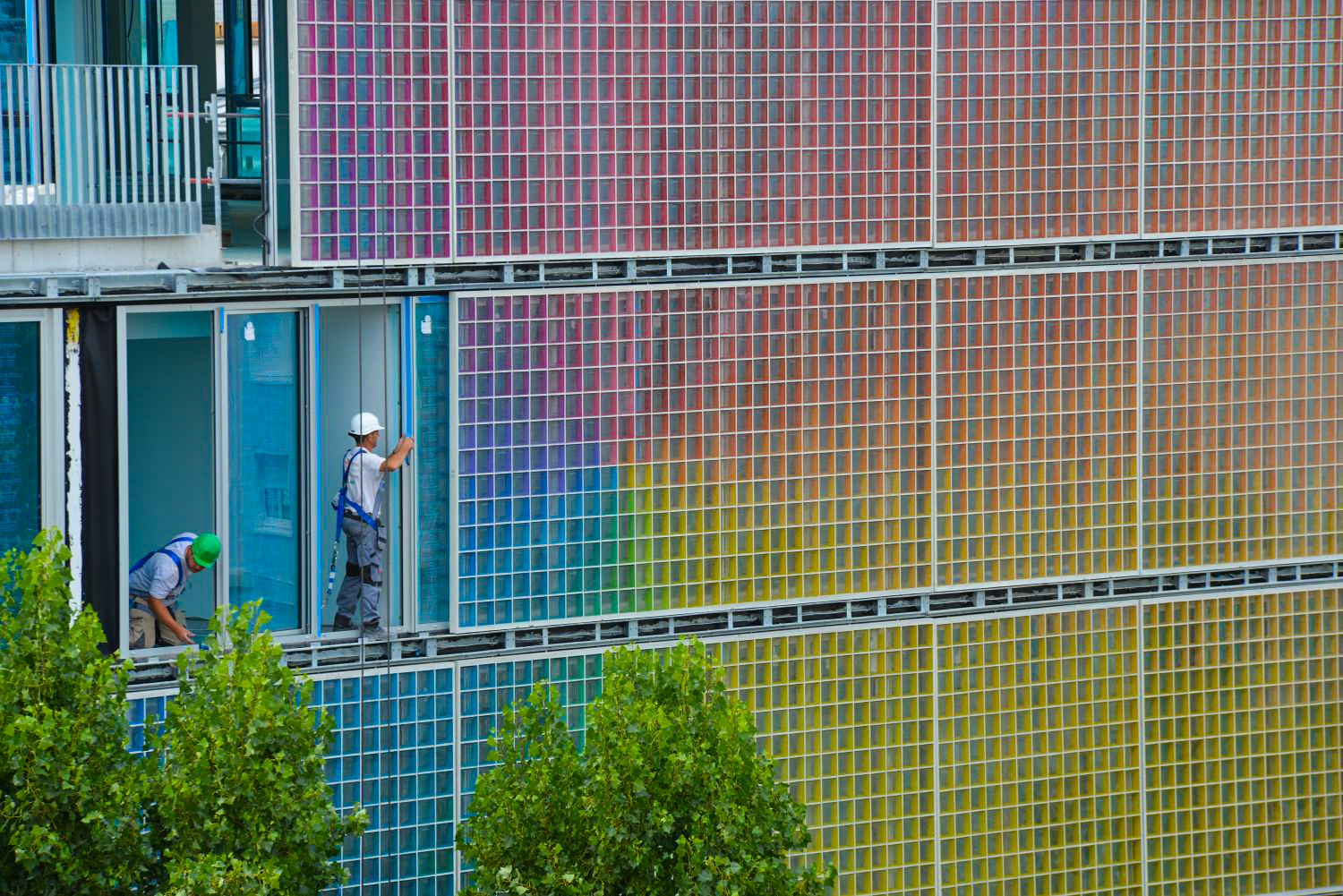- Depuis la rue : une sensation d’homogénéité et de fluidité s’impose. La façade réagit aux interférences lumineuses du jour et de la nuit, créant une œuvre en perpétuelle mutation.